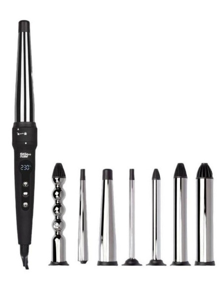 Professional Curling Iron "STILE" – 7 Interchangeable Barrels, Chrome-Plated Titanium Finish. Achieve salon-perfect curls with the Professional 7-in-1 Curling Iron, designed to adapt to every hair type and styling need. Featuring seven interchangeable barrels with a chrome-plated titanium finish, it allows you to effortlessly create anything from tight spirals to soft, voluminous waves – all with professional precision. Perfect curls in seconds! The adjustable temperature (100°C–230°C) and fast heat-up system ensure consistent, even styling, while the anti-heat tips keep your hands safe and comfortable. Includes 7 interchangeable barrels: Ø10 mm curling iron, Ø16 mm curling iron, Ø25 mm curling iron, Ø32 mm curling iron, Ø10–19 mm conical curling iron, Ø19–32 mm conical curling iron, Ø25 mm special “bubble” curling iron. Technical Features: Adjustable temperature: 100°C–230°C, Automatic shut-off: after 60 minutes of inactivity, Digital display: shows precise temperature, Soft-touch handle: for a comfortable, secure grip, Quick lock/unlock system: for easy barrel changes, 3 m professional swivel cable for free movement, Universal voltage: 110–240V ~ 50/60Hz, Weight: 190–240 g, Length: 36 cm. Benefits: 7 barrels for endless styling possibilities, Professional performance with fast, even heat distribution, Smooth, shiny, long-lasting curls for all hair types.