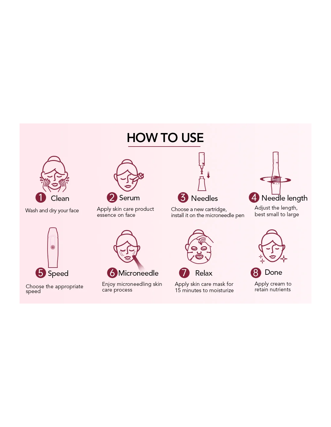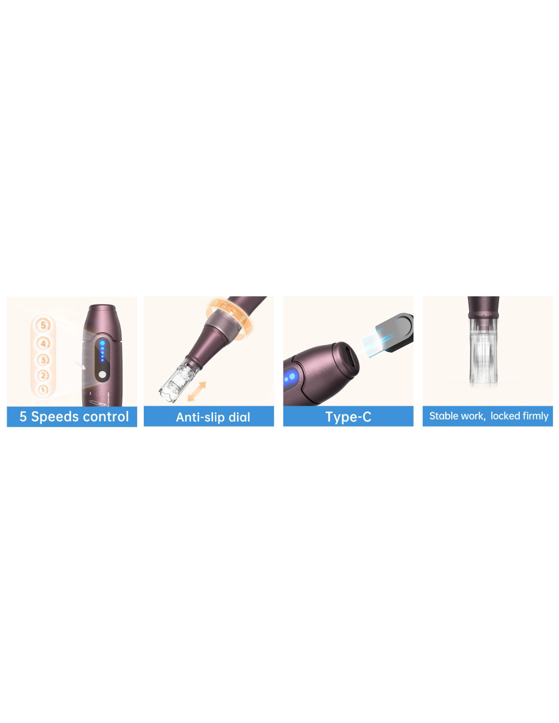 This device has a wide range of applications, ergonomic design, metal body, powerful motor, five speeds with smooth adjustment, puncture depth up to 2.5 mm. Effective for correcting problems on any part of the body. When using it, you can achieve maximum profitability of the procedures due to their quick and high-quality performance, and inexpensive components. It is used to remove deep wrinkles, restore the collagen framework, treat scars, scars, post-acne, stretch marks, cellulite, hyperpigmentation. Also used for baldness, and for median peeling. With its help, you can effectively deal with such problems as sagging skin, acne, large pores, excess fat deposits, "double" chin. 5 speed levels LED light gear speed display, looks more intuitive. 1-5 speed levels can meet different needs of treatment. Adjustable needle size: 0-2.5 mm Waving design of the cartridge's edge, it helps to distribute the serum evently and massage the skin to better absorb the serums. All in one button, speed control & power on / off Wireless model, convenient to use. Blister packaging for needle cartridge, more safe and hygiene. Specification: Battery capacity: 380 mAh Speed: 5 levels Adjustable needle length: 0 - 2.5 mm Charging: USB with Type-C interface Pen material: Aluminium alloy Dimension: 17*13*6 cm / 350 g
