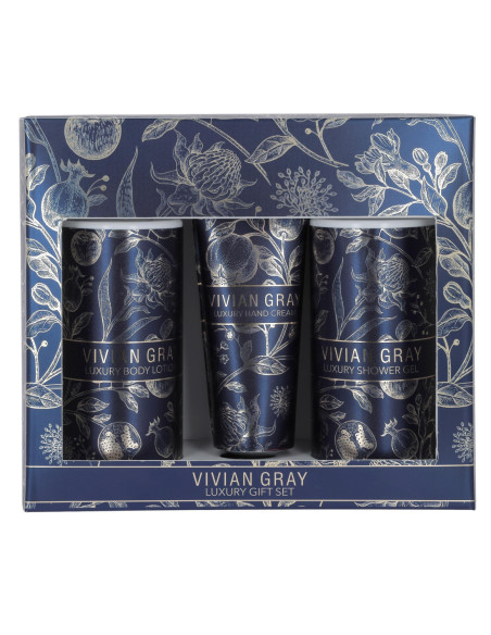ivian Gray Blue Botanical Luxury Gift Set – refined care with a touch of jasmine and patchouli. Discover the elegance of the Vivian Gray Blue Botanical gift set – three aromatic body-care products with a sophisticated jasmine and patchouli fragrance. This set transforms everyday care into a pleasant, luxurious ritual. The set includes: Vivian Gray Blue Botanical Body Lotion: A lightweight body lotion that refreshes, soothes, and tones the skin. Absorbs quickly. Effectively prevents dryness and flakiness while helping to restore smoothness and comfort. How to use: Apply a small amount to clean skin and massage gently. Vivian Gray Blue Botanical Shower Gel: A gentle shower gel with a mild cleansing formula. It cleanses without irritating the skin and leaves a subtle fragrance. How to use: Apply to damp skin, lather gently, and rinse off. Vivian Gray Blue Botanical Hand Cream: A nourishing hand cream with restoring and moisturizing properties. Softens the skin, improves elasticity, and provides long-lasting care, even for very dry hands. Fragrance: a refined blend of jasmine and patchouli notes. How to use: Apply to clean, dry hands and massage until fully absorbed. Vivian Gray gift sets are the perfect present and a touch of luxury! Add the Blue Botanical elegance to your daily skincare routine.