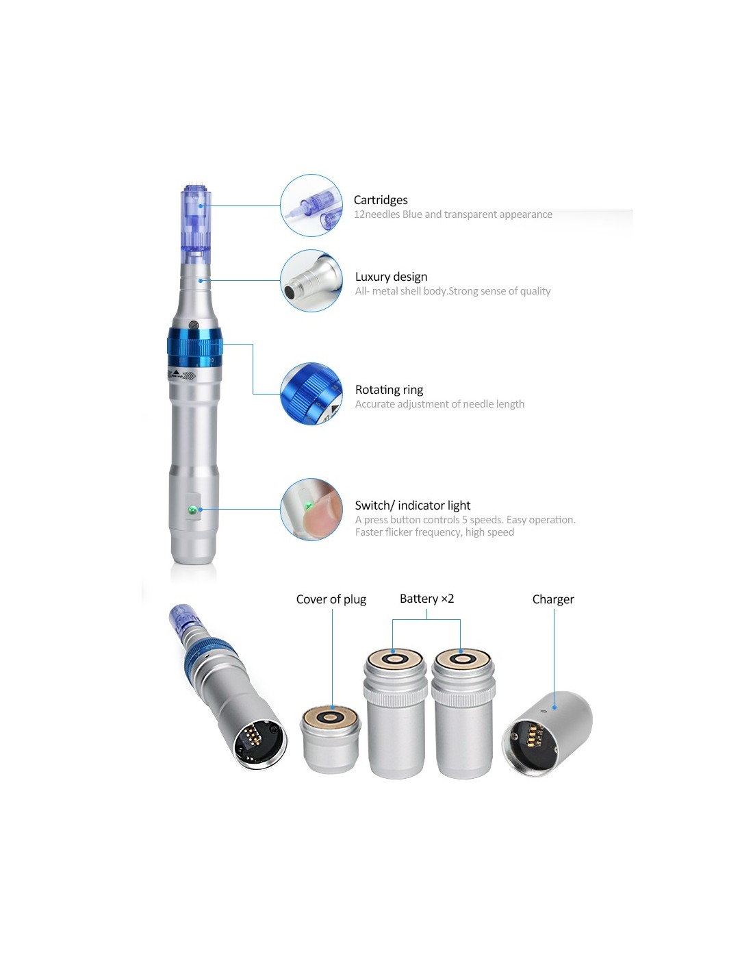 Dr. Pen Ultima A6 mikroadatu dermapens ir profesionāls ādas kopšanas instruments, kas paredzēts, lai uzlabotu smalko līniju, grumbu, rētu, striju, paplašinātu poru, ādas vaļīguma, hiperpigmentācijas un saules radītu bojājumu izskatu.