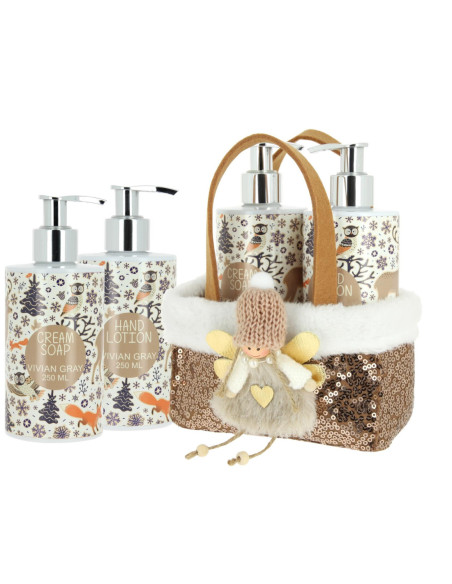 Vivian Gray Ziemassvētku dāvanu komplekts. Svētku duets, kas lutina un iepriecina! Grezns Ziemassvētku komplekts, kurā iekļautas krēmveida šķidrās roku ziepes un mitrinošs roku krēms, piesātināti ar siltu un nomierinošu vaniļas un ilang-ilang aromātu. Ideāls veids, kā piešķirt ikdienas skaistumkopšanai svētku noskaņu un maigu greznības pieskārienu. Bagātīga formula: Krēmveida šķidrās ziepes maigi un saudzīgi attīra rokas, padarot ādu mīkstu, gludu un komfortablu. Mitrinošais roku krēms intensīvi baro un atjauno ādu, pasargājot no sausuma un atjaunojot dabisko ādas elastību. Ilang-ilang un vaniļas aromāts: Eksotiskā ilang-ilang un saldās vanilas kombinācija veido siltu, relaksējošu un patiesi ziemīgu aromātu - ideālu Ziemassvētku smaržu, kas apņem sajūtas ar mājīgumu un svētku prieku. Elegants iesaiņojums: Komplekts ir gaumīgi iepakots skaistā dāvanu maisiņā - lieliska dāvana kādam īpašam cilvēkam vai arī burvīgs veids kā palutināt sevi svētku sezonā. Eko un ētika: Produkti ir 100% vegāniski un nav testēti uz dzīvniekiem, izstrādāti ar rūpēm gan par ādu, gan par apkārtējo vidi. Ideāla dāvana Ziemassvētkiem. Stilīga, grezna un sirsnīga — dāvana, kas noteikti iepriecinās ikvienu, kurš novērtē kvalitatīvu ķermeņa kopšanu un svētku aromātus. Lietošana Krēmveida Ziepes: Uzklājiet nelielu daudzumu ziepes uz samitrinātām rokām. Saputojiet un noskalojiet. Losjons: Lietošana: Uzklājiet losjonu uz tīras un sausas roku ādas. Maigi iemasējiet, līdz tas pilnībā uzsūcies.